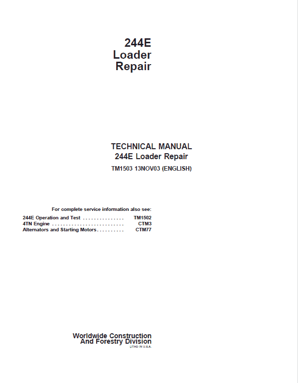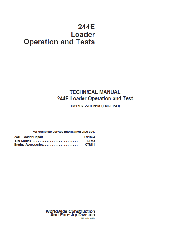 The John Deere 244E Loader Technical manuals are divided in two parts: Repair and Operation and Tests.