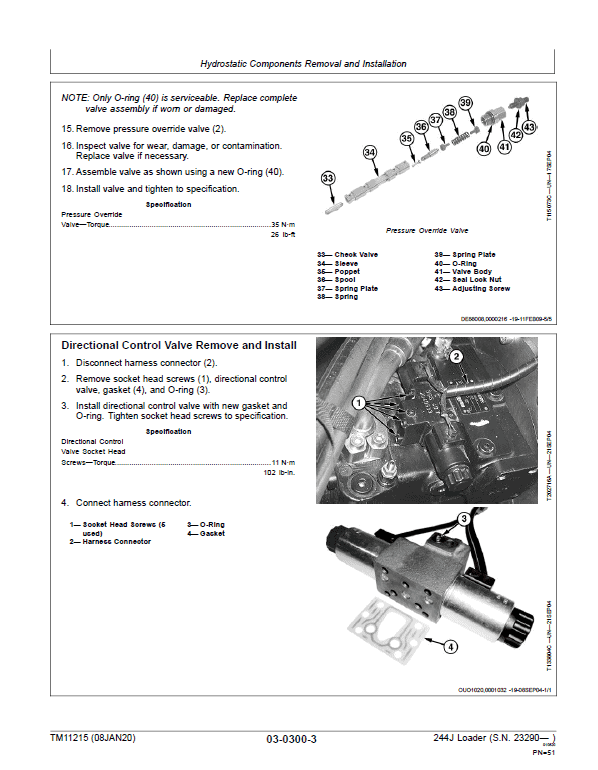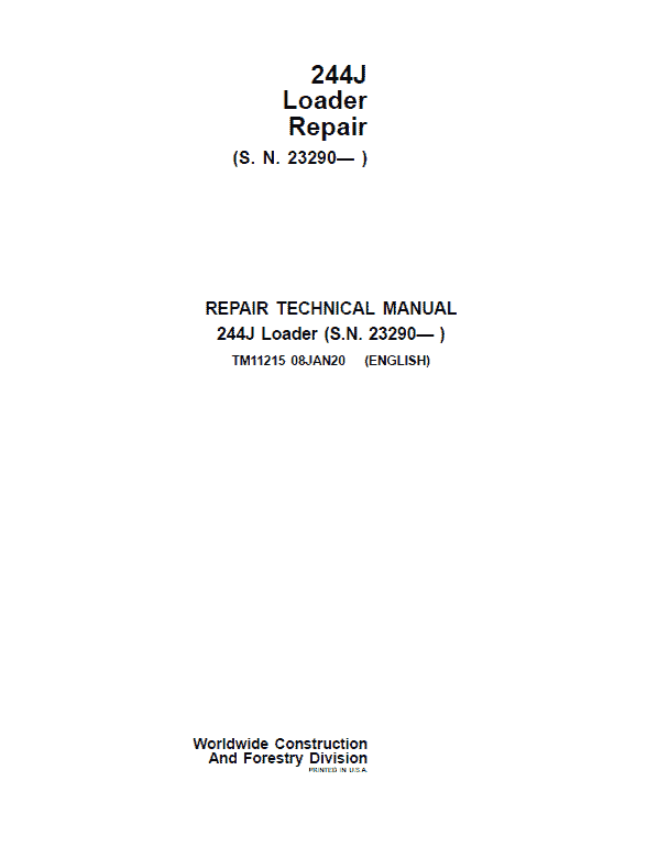 The John Deere 244J (Serial after 23290 -) Loader Technical manuals are divided in two parts: Repair and Operation and Tests.