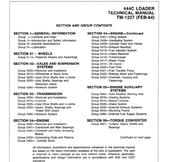 This Service Manual for John Deere 444C Loader is for a technician and contains sections that are only for this Loader model. Technical/Service manuals sections tell how to repair the components. Diagnostic sections help you identify the majority of routine failures quickly. Information is in groups for the various components requiring service instruction. At the beginning of each group are summary listings of all applicable essential tools, service equipment and tools, other materials needed to do the job, service parts kits, specifications, wear tolerances, and torque values.