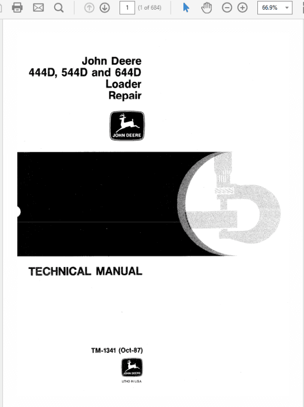 This Service Manual for John Deere 444D, 544D and 644D Loader is for a technician and contains sections that are only for this Loader model. Technical/Service manuals sections tell how to repair the components. Diagnostic sections help you identify the majority of routine failures quickly.