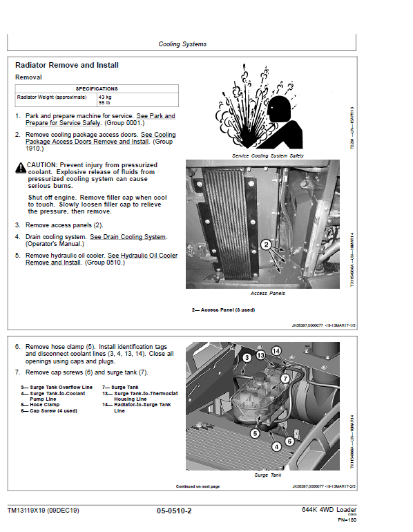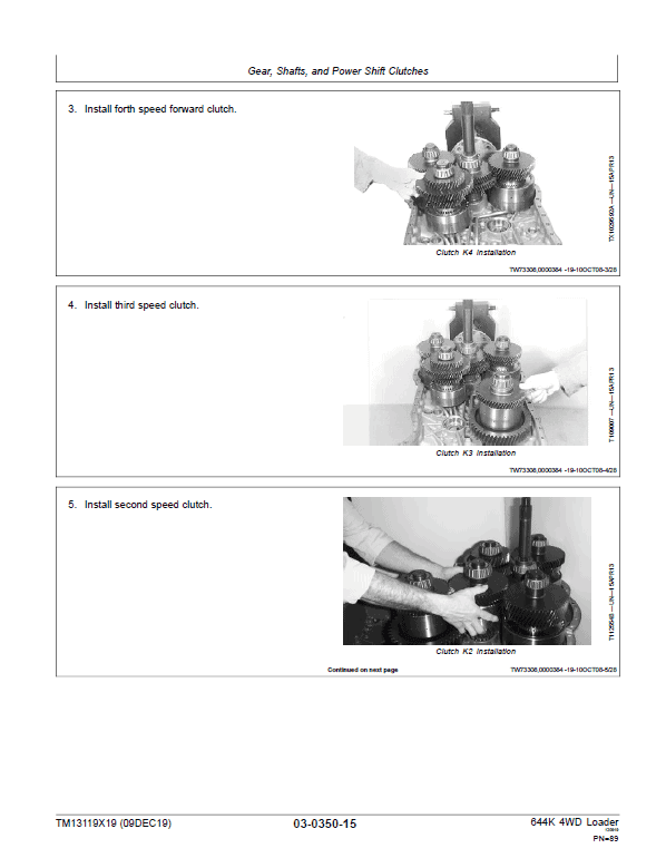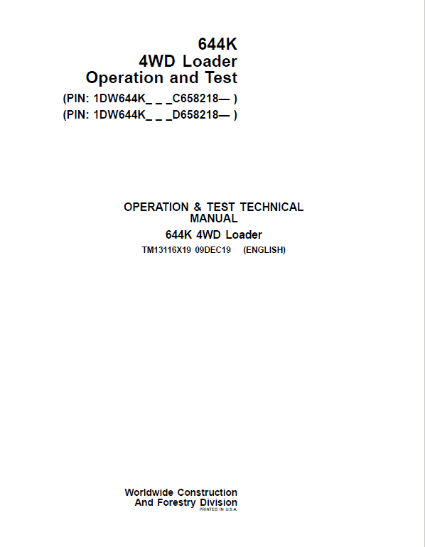 The John Deere 644K 4WD (Serial after C658218 & D658218 – ) Loader Technical manuals are divided in two parts: Repair and Operation and Tests.