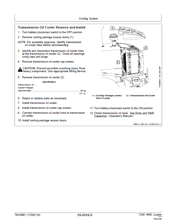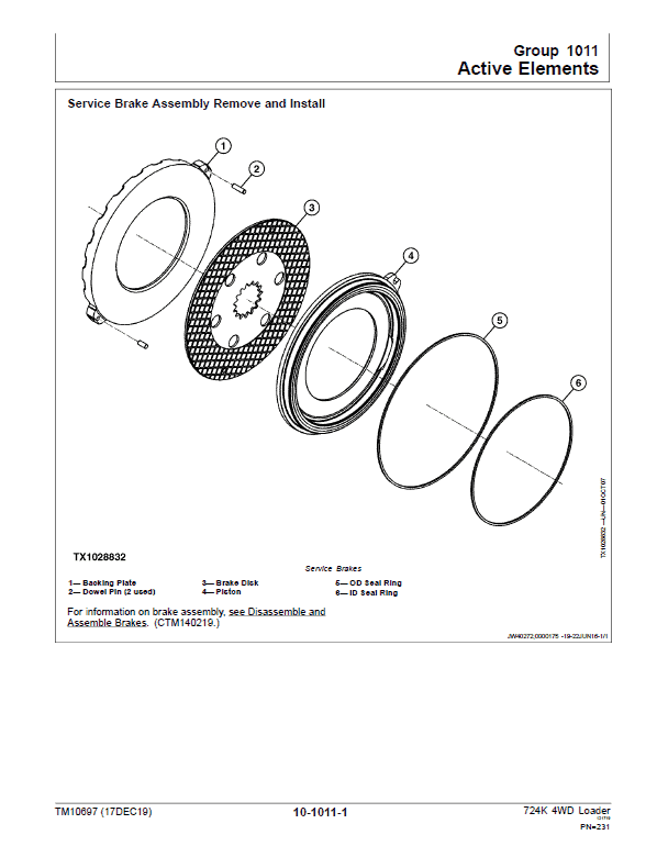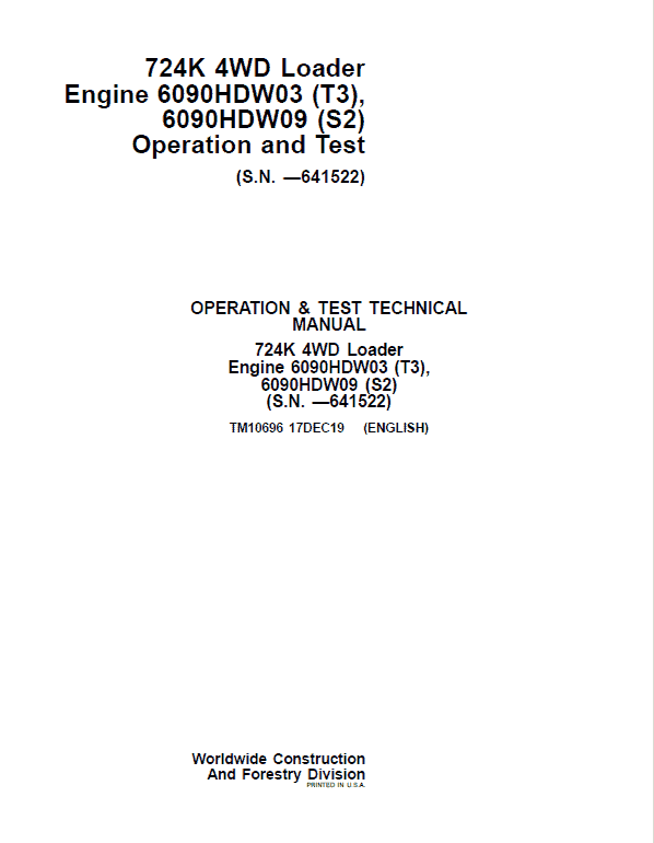 The John Deere 724K 4WD (Serial before – 641522) Loader Technical manuals are divided in two parts: Repair and Operation and Tests.