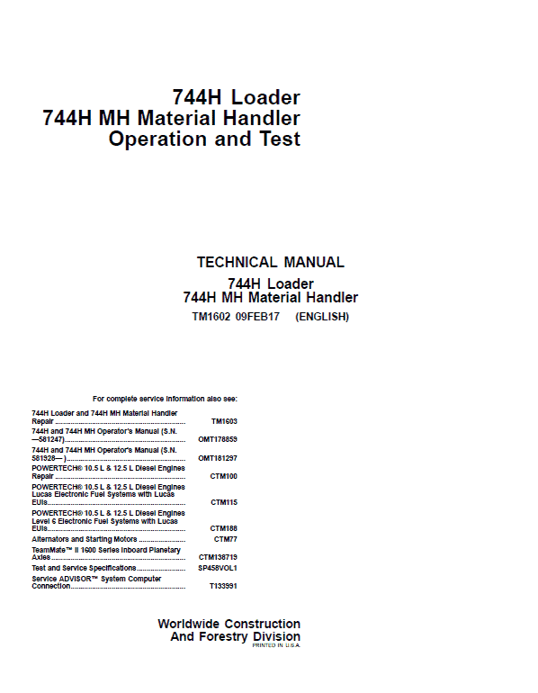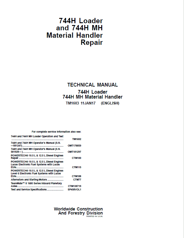 The John Deere 744H and 744H MH Loader Technical manuals are divided in two parts: Repair and Operation and Tests.
