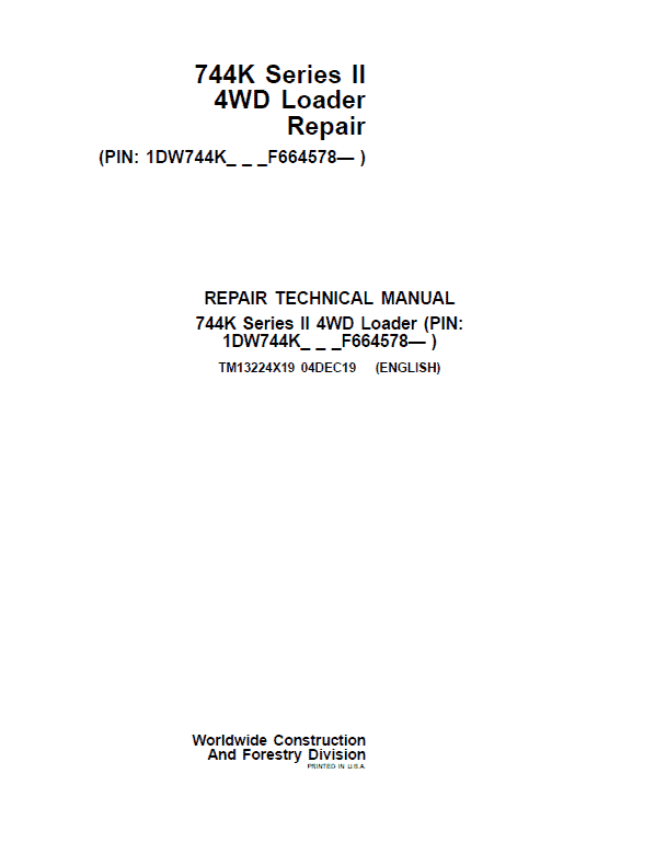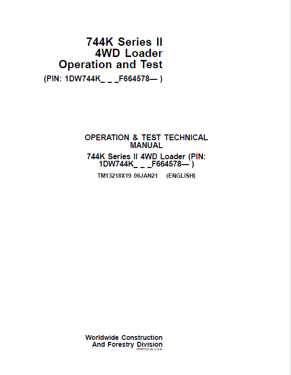 The John Deere 744K 4WD (Serial after 1DW744_ F664578 -) Loader Technical manuals are divided in two parts: Repair and Operation and Tests.