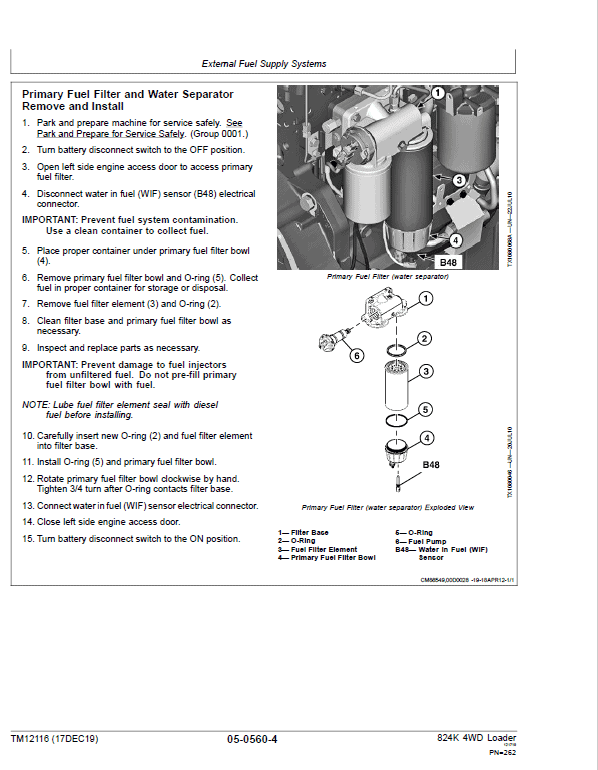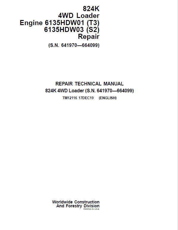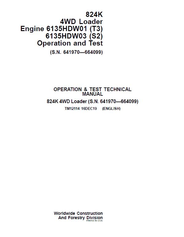 The John Deere 824K 4WD (Serial between 641970 – 664099) Engine T3 & S2 Loader Technical manuals are divided in two parts: Repair and Operation and Tests.