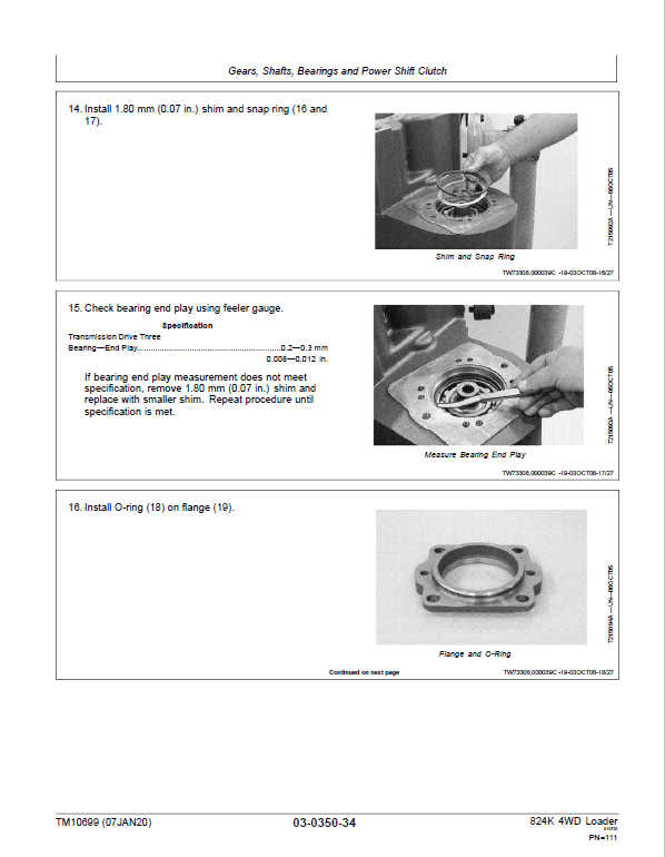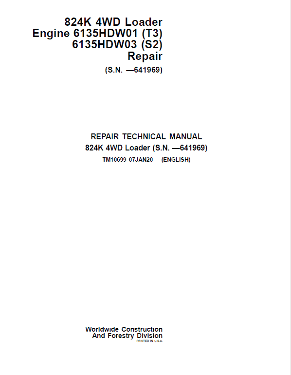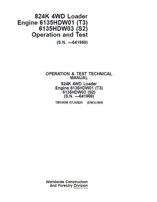 The John Deere 824K 4WD (Serial between 641970 – 664099) Engine T3 & S2 Loader Technical manuals are divided in two parts: Repair and Operation and Tests.
