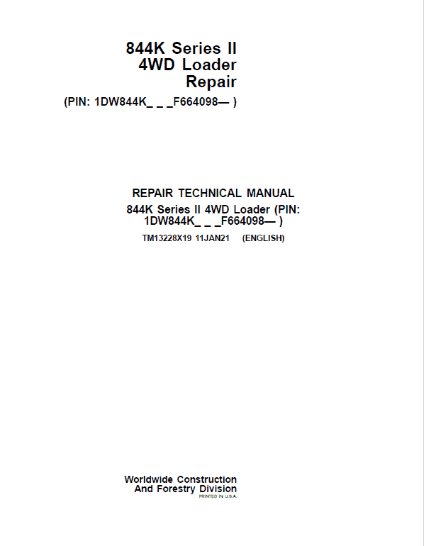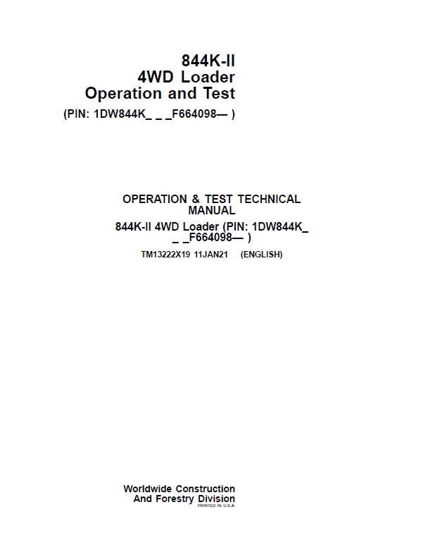 The John Deere 844K 4WD (Serial after F664098 -) Loader Technical manuals are divided in two parts: Repair and Operation and Tests.
