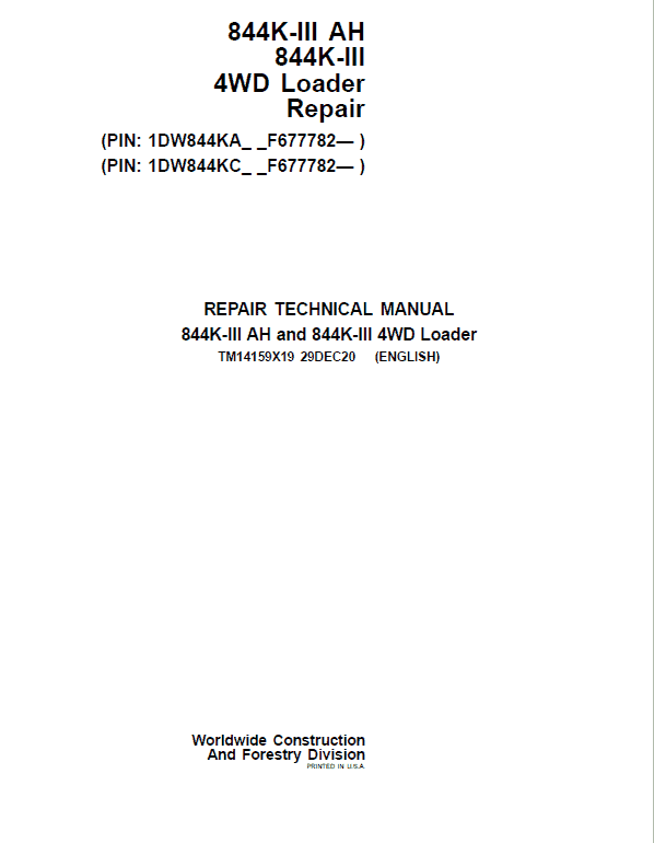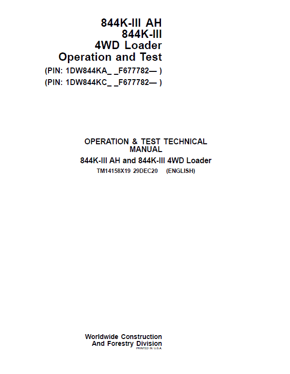 The John Deere 844K-III 4WD (Serial after F677782 -) Loader Technical manuals are divided in two parts: Repair and Operation and Tests.