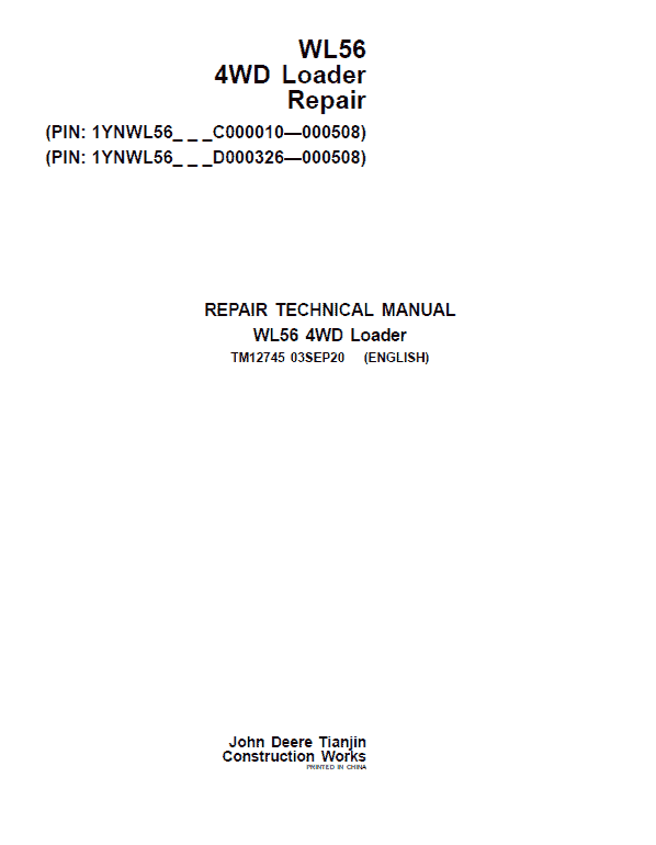 The John Deere WL56 4WD (Serial between C000010- C000508 and D000326 – D000508) Loader Technical manuals are divided in two parts: Repair and Operation and Tests.