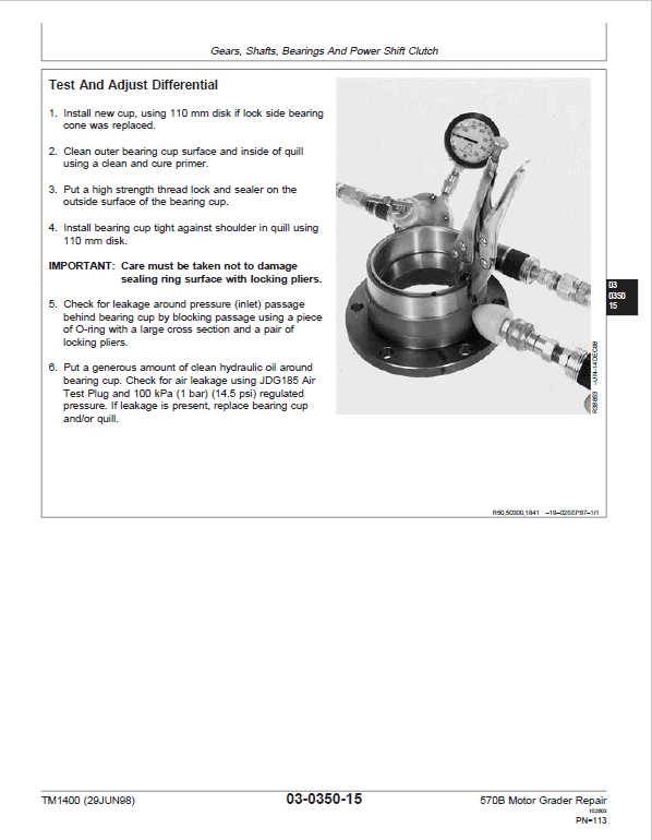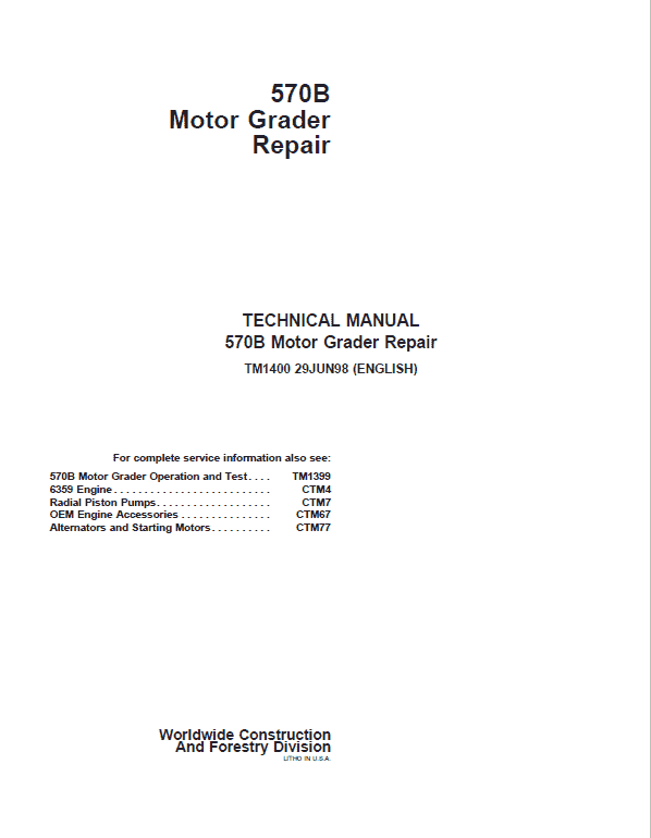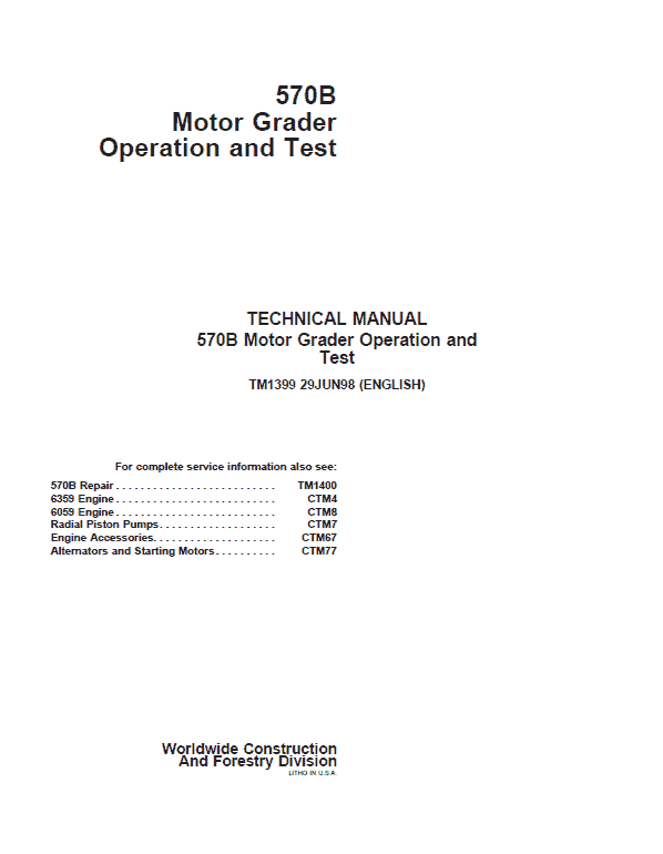 The John Deere John Deere 570B Grader Technical manuals are divided in two parts: Repair and Operation and Tests.