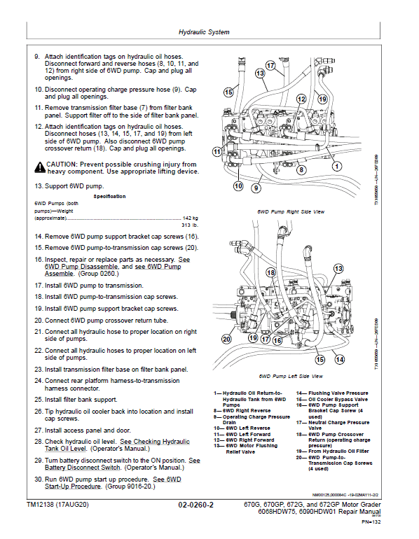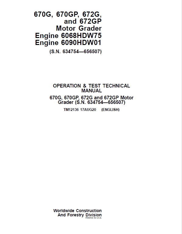 The John Deere John Deere 670G, 670GP, 672G, 672GP Grader Manual (Serial Number 634754 – 656507 and Engines 6068HDW75 & 6090HDW01) Technical manuals are divided in two parts: Repair and Operation and Tests.