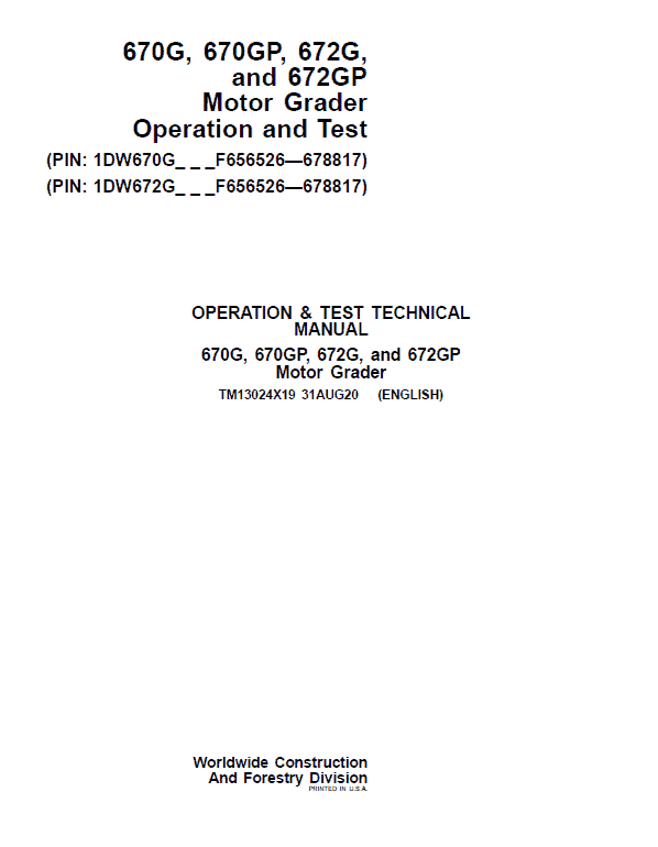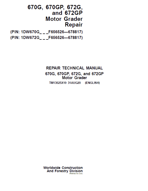 The John Deere John Deere 670G, 670GP, 672G, 672GP Grader Manual (Serial Number F656526 to F678817) Technical manuals are divided in two parts: Repair and Operation and Tests.