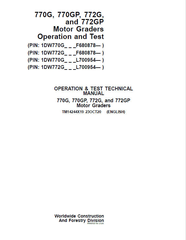 The John Deere John Deere 770G, 770GP, 772G, 772GP Grader Manual (Serial Number after F680878 & L700954 – ) Technical manuals are divided in two parts: Repair and Operation and Tests.
