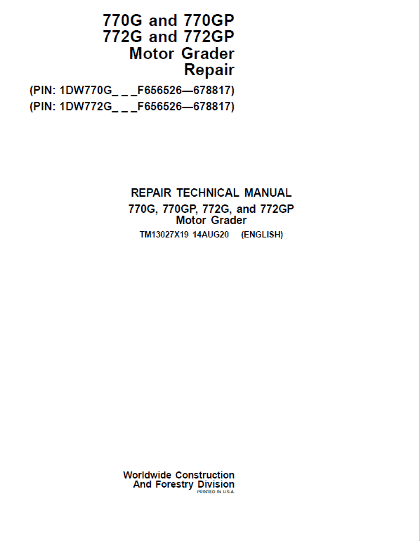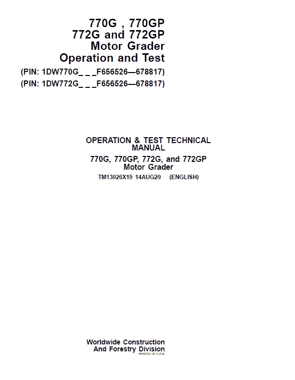 The John Deere John Deere 770G, 770GP, 772G, 772GP Grader Manual (Serial Number F656526 -F678817) Technical manuals are divided in two parts: Repair and Operation and Tests.