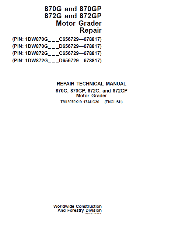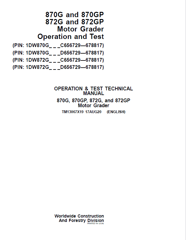 The John Deere John Deere 870G, 870GP, 872G, 872GP Grader Manual (Serial Number 656729 -678817 as detailed above) Technical manuals are divided in two parts: Repair and Operation and Tests.