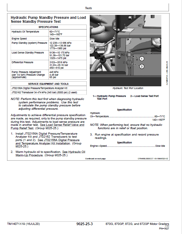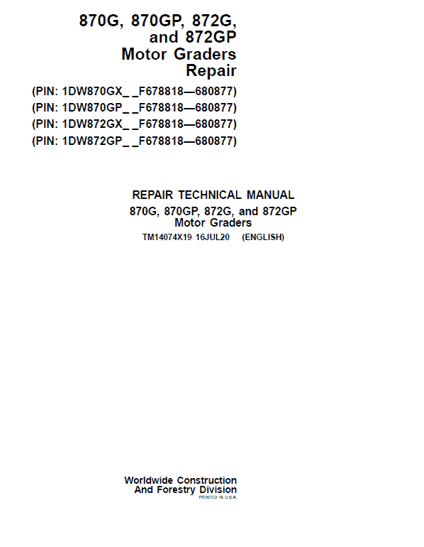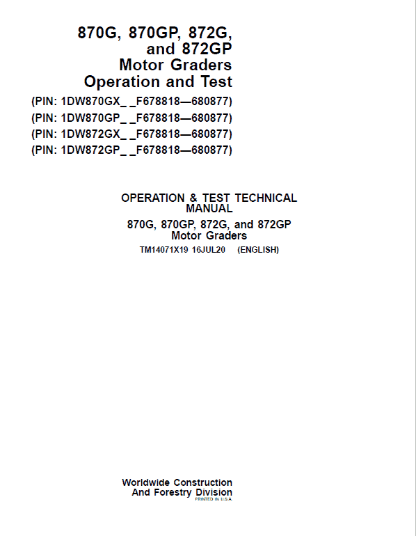 The John Deere John Deere 870G, 870GP, 872G, 872GP Grader Manual (Serial Number F680878 – F680877 as detailed above) Technical manuals are divided in two parts: Repair and Operation and Tests.