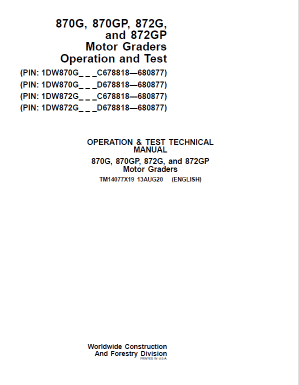 The John Deere John Deere 870G, 870GP, 872G, 872GP Grader Manual (Serial Number 680878 – 680877 as detailed above) Technical manuals are divided in two parts: Repair and Operation and Tests.