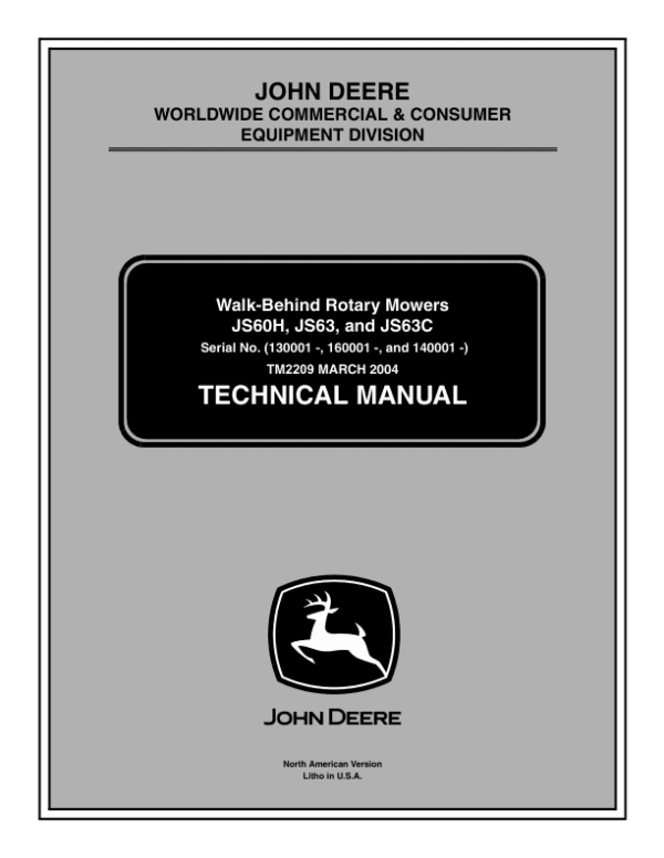 - John Deere JS60H, JS63, JS63C Walk Behind Rotary Mowers Repair Manual – 88 Pages