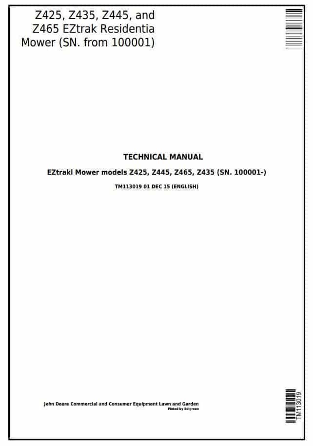 TM113019 – John Deere Z425, Z435, Z445, Z465 EZtrak Residential Mower (SN.100001-) Technical Service Manual
