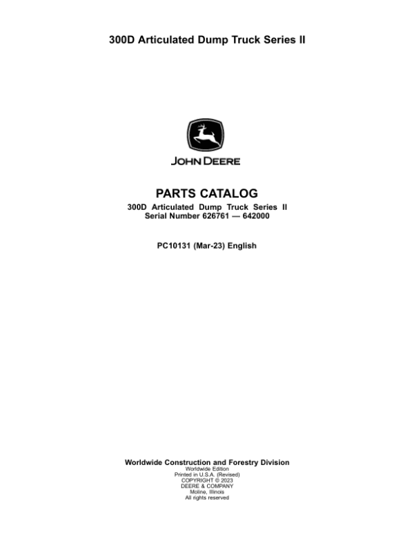 - John Deere 300D Series II Articulated Dump Trucks (SN 626761 – 642000) Parts Catalog – 568 Pages