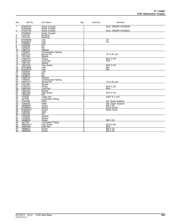 John Deere 314G Skid Steers (SN 1T0314G_ J366358) Parts Catalog Manual