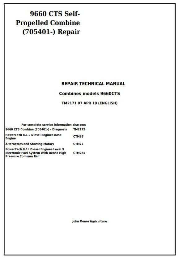 TM2171 – John Deere 9660 CTS Self-Propelled Combine (SN.from 705401) Service Repair Technical Manual
