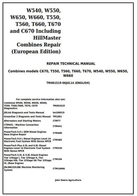 TM401519 – John Deere W540, W550, W650, W660, T550, T560, T660, T670, C670 Combines Service Repair Manual