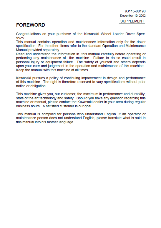 Kawasaki 95ZV Wheel Loader Operating (Owners) Manual – 22 Pages