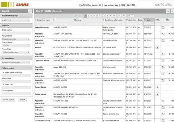 Claas WebTIC offline gives you easy and quick access to technical information for CLAAS machines. All documents, instructions, catalogs for this equipment will be at your fingertips, that is, they will be freely available on your computer. This will provide you with offline access to documents and information at any time. Namely, you can familiarize yourself with this information (Document type):