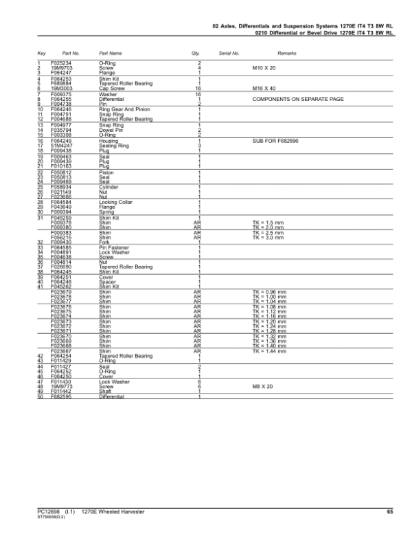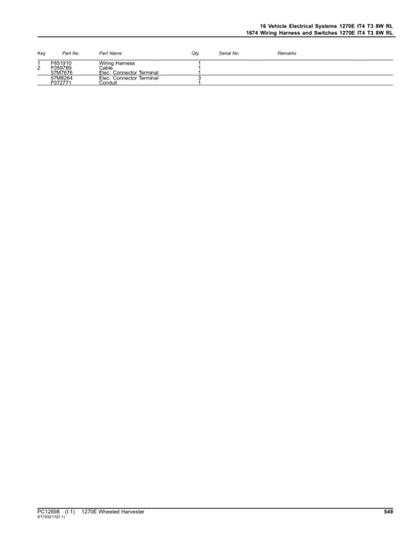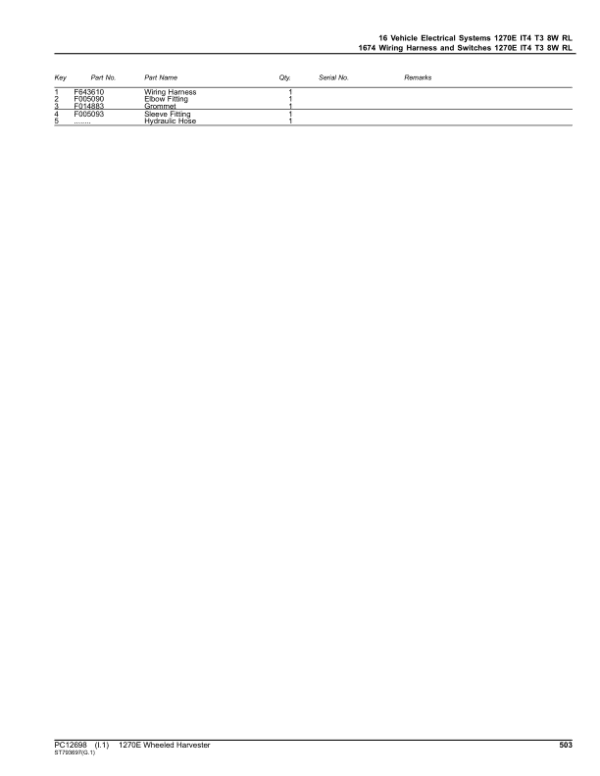 John Deere 1270E IT4 T3 8W Wheeled Harvesters (SN 003009 –003173) Parts Catalog Manual