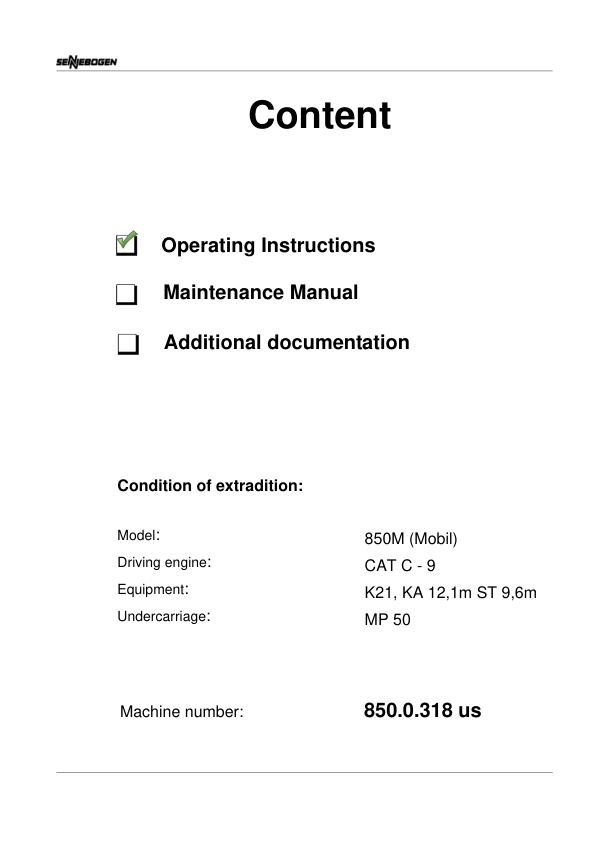 - Sennebogen 850.0.318 Operating Instruction Manual – 188 Pages