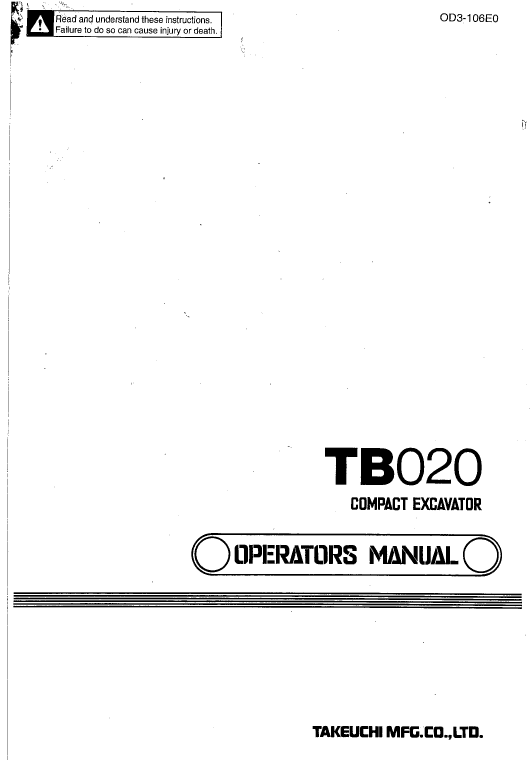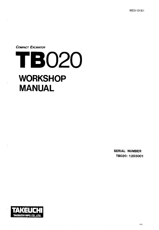 The Takeuchi TB020 manual is intended for persons who engage in maintenance operations, and explains procedures for disassembly and reassembly of the machine, check and maintenance procedures, maintenance reference values, troubleshooting and outline specifications, etc. Please use this Takeuchi manual for excavator TB020 as a reference in service activities to improve maintenance techniques.