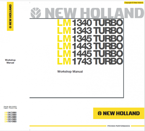 The LM1340, LM1342 and LM1345 Telehandlers Workshop Manual is wrote by New Holland repair specialist. It provides important information on carrying out repair work expertly. Please go carefully through the Workshop Manual of the Telehandlers before starting any repair work. Use the Workshop Manual of the LM1340, LM1342 and LM1345 Telehandlers as a reference book and source of information even if you are familiar with Telehandlers technology. Using the Workshop Manual, the experience construction machine mechanic can carry out any necessary repairs expertly.