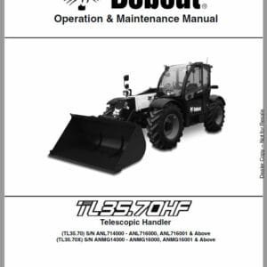 This manual is for the Bobcat TL34.65, TL35.70, TL38.70 VersaHANDLER Telescopic. It provides necessary servicing and adjustment procedures for the Bobcat TL34.65, TL35.70, TL38.70 VersaHANDLER Telescopic and its components and systems. Refer to the Operation & Maintenance Manual and service manual for operating instructions, repair, starting procedure, daily checks, etc.
