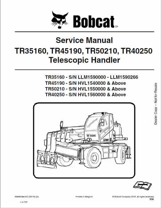 These manual is for the Bobcat TR35160, TR40250, TR45190, TR50210 Telescopic. It provides necessary servicing and adjustment procedures for the Bobcat TR35160, TR40250, TR45190, TR50210 Telescopic and its components and systems. Refer to the Operation & Maintenance Manual and service manual for operating instructions, repair, starting procedure, daily checks, etc.