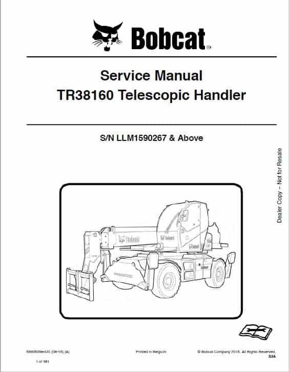 This manual is for the Bobcat TR38160 TR38160 EVO VersaHANDLER Telescopic. It provides necessary servicing and adjustment procedures for the Bobcat TR38160, TR38160 EVO VersaHANDLER Telescopic and its components and systems. Refer to the Operation & Maintenance Manual and service manual for operating instructions, repair, starting procedure, daily checks, etc.