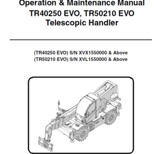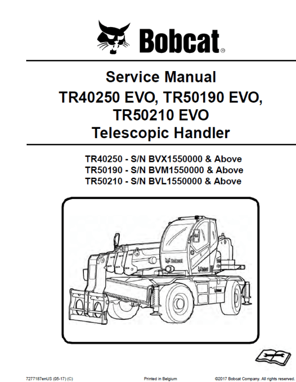 This manual is for the Bobcat TR40250 EVO, TR50190 EVO, TR50210 EVO VersaHANDLER Telescopic. It provides necessary servicing and adjustment procedures for the Bobcat TR40250 EVO, TR50190 EVO, TR50210 EVO VersaHANDLER Telescopic and its components and systems. Refer to the Operation & Maintenance Manual and service manual for operating instructions, repair, starting procedure, daily checks, etc.