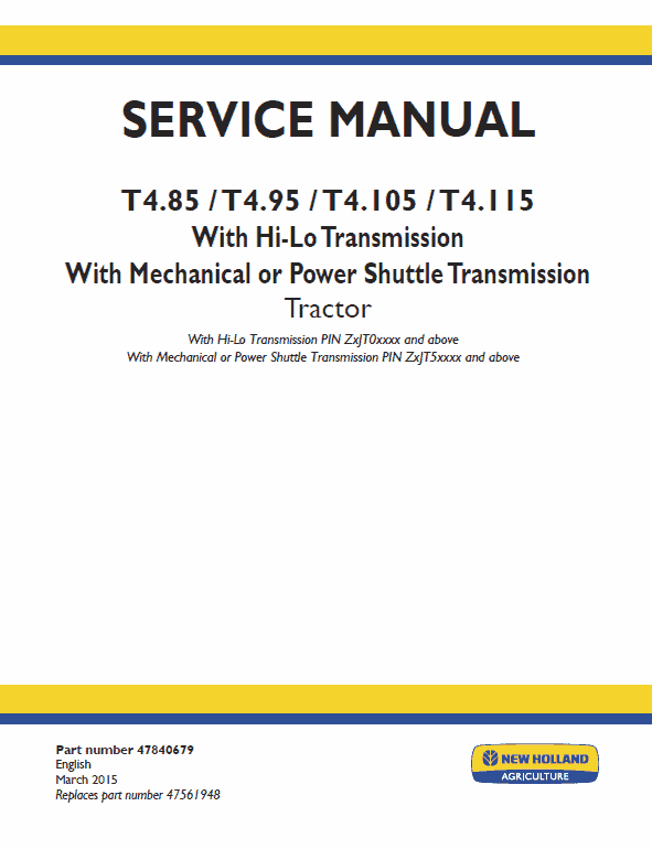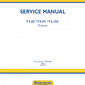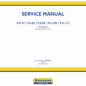 This service manual provides the technical information needed to properly service the New Holland T4.75, T4.85, T4.95, T4.105, T4.115 transmission, Axle and other parts of the Tractor. Use this manual in conjunction with the operators manual for complete operation, adjustment, and maintenance information. Read this manual carefully before starting, using, carrying out refueling or performing any other type of operation on the tractor.