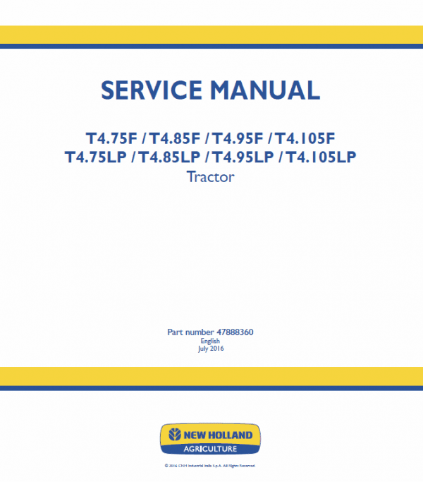 This service manual provides the technical information needed to properly service the T4.75LP, T4.85LP, T4.95LP, T4.105LP transmission, Axle and other parts of the Tractor. Use this manual in conjunction with the operators manual for complete operation, adjustment, and maintenance information. Read this manual carefully before starting, using, carrying out refueling or performing any other type of operation on the tractor.