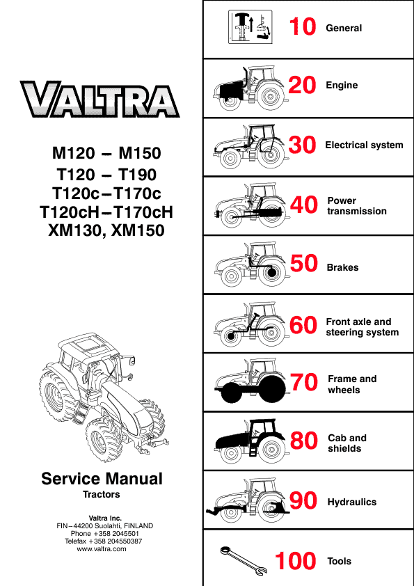 The Valtra T120c, T120ch, T130c, T130ch, T140c, T140ch, T160c, T160ch, T170c, T170ch Tractors Manual is intended to be a practical reference source to be used in workshop. The repair instructions in the manual are based on methods which have been worked out in practice during normal workshop conditions and which are based on the use of special tools from the manufacturer when stated in the instructions.